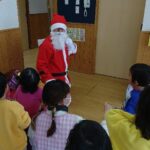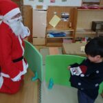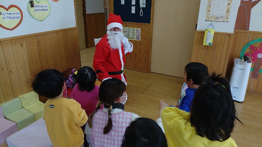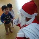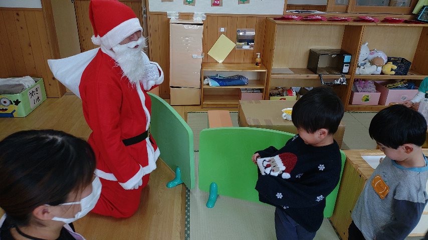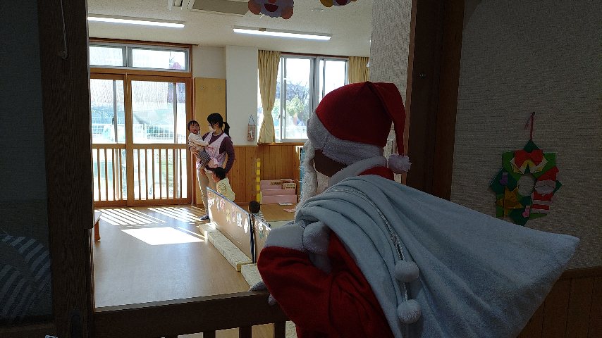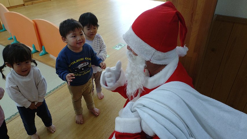 乳児棟にもサンタさんが来ましたよ。サンタさんの服の子もいて、サンタもびっくりしてたね。